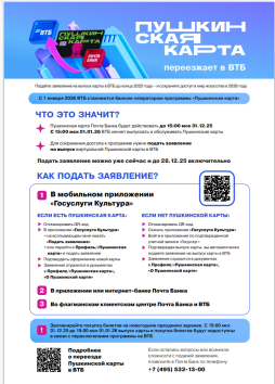 Для получения новой виртуальной карты необходимо до 28.12.2025 подать заявление одним из способов:через мобильное приложение «Госуслуги.Культура»;лично в любом отделении Почта Банка или Банка ВТБ; онлайн в приложении Почта Банк.